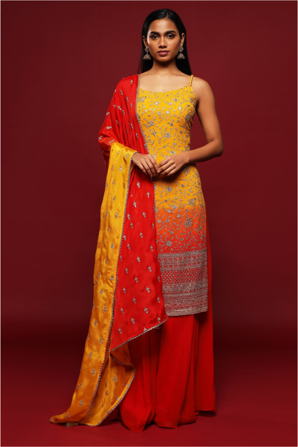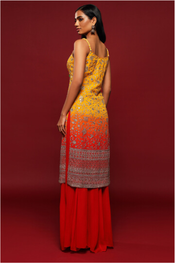 Dive into lively hues like sunny yellow, fresh green, or opulent gold. Discover the elegance of traditional Indian attire with this stunning Yellow And Red Ombré Thread Work Long Kurta Top And Fiery Red Palazzo Pant Set. The set is complemented by a beautifully shaded dupatta, featuring all-over gold and silver sequined details for a touch of glamour. Enhance with elegant jhumkas or stackable bangles for a standout festive look.