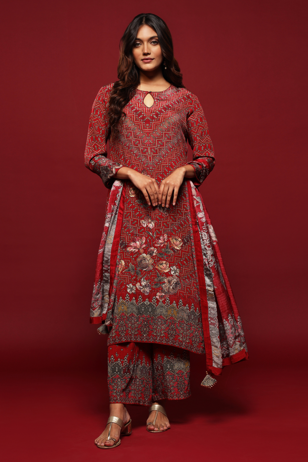 Upgrade your wardrobe with the beautiful Brick Red Floral Printed Long Kurta Top and Wide-Legged Pants set, complete with a matching lightly embellished dupatta. The rich brick red hue perfectly complements the intricate floral print and the matching dupatta with delicate embellishments adds elegance. The long kurta top provides a sleek look, while the wide-legged pants offer undeniable comfort.
